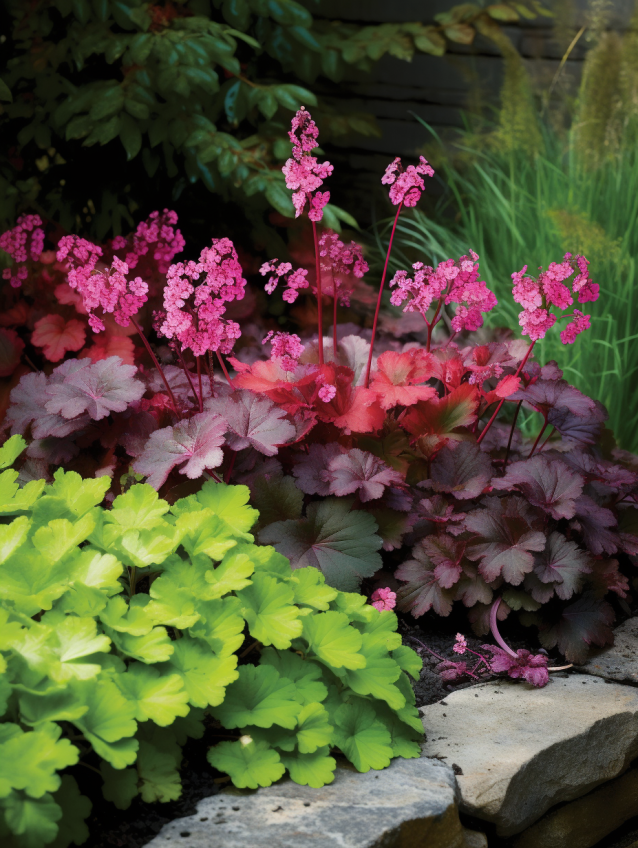 Coral bells offer colorful foliage in shades of red, bronze, green, plum, or chartreuse, brightening up any shady spot. Some varieties also produce showy wands of pink, white, or red bell-like flowers that bloom from late spring to early summer 8.
