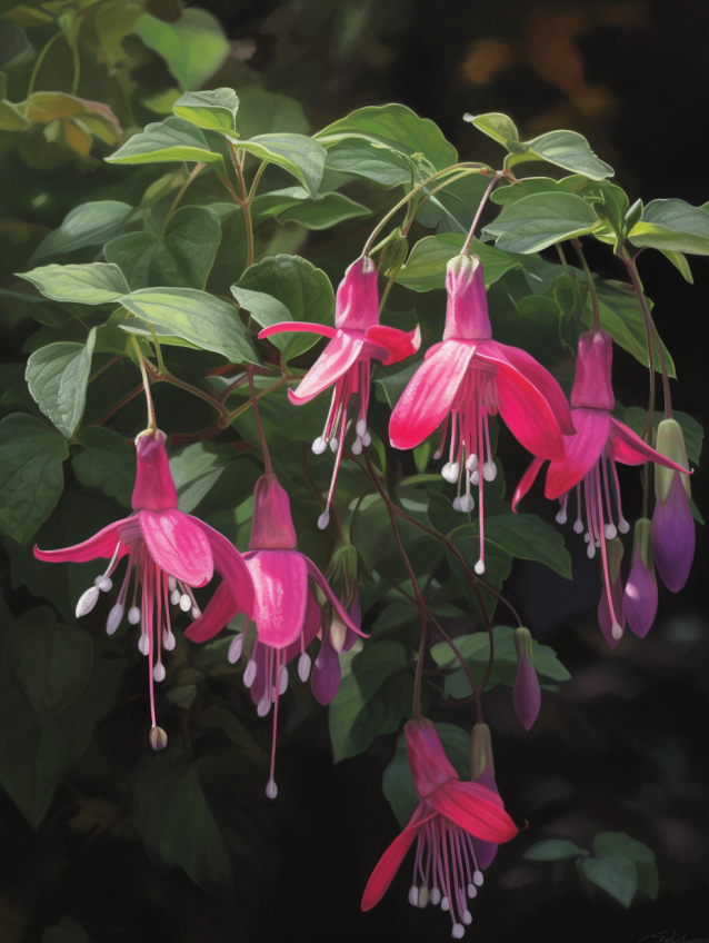 Fuchsia thrives in partial to full shade and blooms all summer long. Its curious design attracts pollinators like hummingbirds, adding both beauty and life to your garden 10.