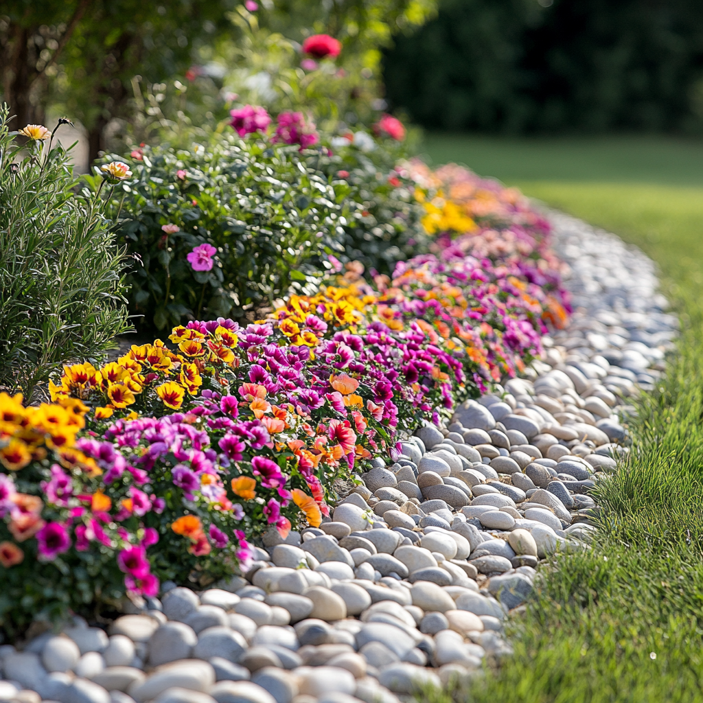 Use small stones or pebbles to create a defined border around your flower bed. This adds a natural touch and helps keep soil and plants neatly contained. The combination of colorful blooms and the natural texture of the stones creates a harmonious and visually appealing garden feature. It is a picturesque and functional addition to any garden or landscape, making it an excellent choice for those seeking an attractive and low-maintenance way to enhance their outdoor space.