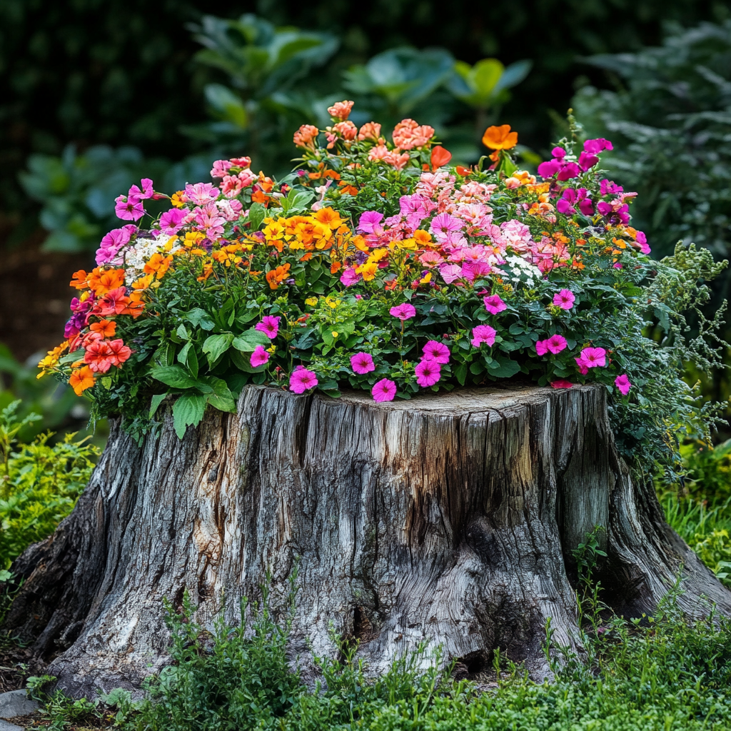 10. Pretty Repurposed Tree Stump Flower Bed