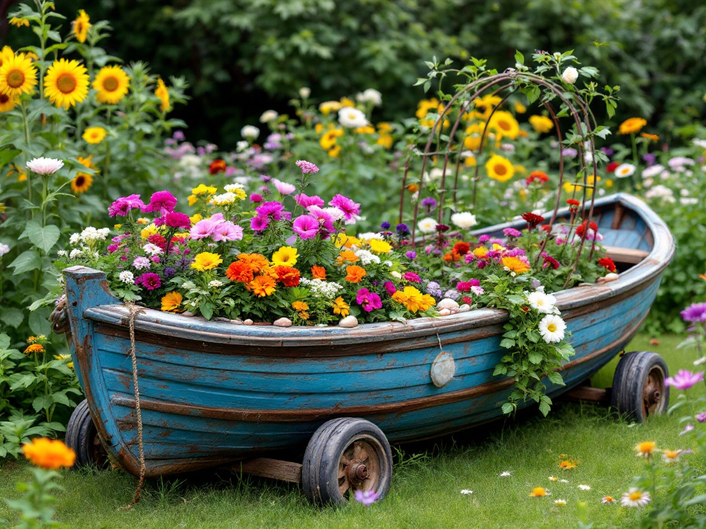 Repurpose a retired boat into a creative planter. This unique feature adds a touch of nautical charm and creates a one-of-a-kind focal point in your garden. The weathered wood and boat shape provide a distinctive backdrop for your greenery, making it a conversation starter and a picturesque addition to your landscape. This imaginative blend of recycling and gardening allows you to transform a piece of history into a flourishing flower bed, offering a captivating and whimsical touch to your outdoor decor.